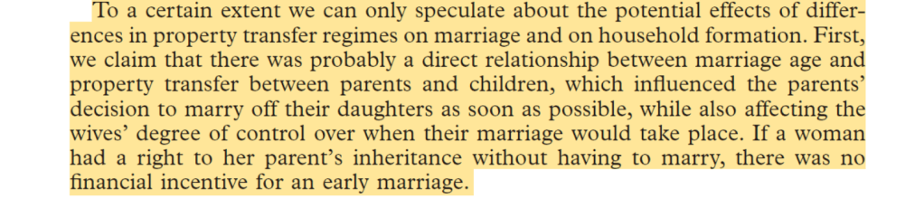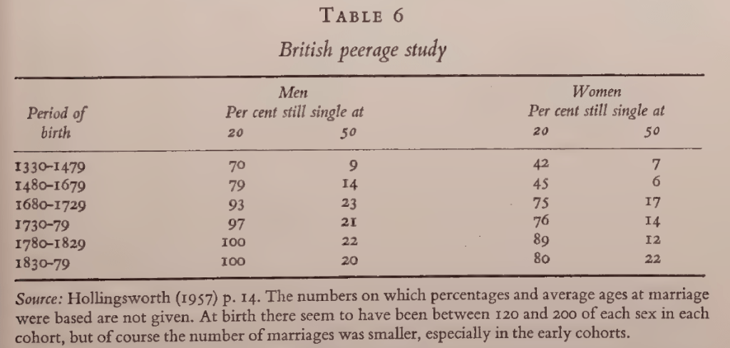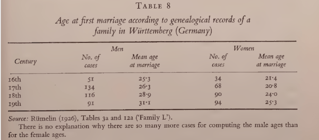 The following texts come from ‘Population in history. Essays in historical demography.’, edited by D. V. Glass and D. E. C. Eversley, specifically the chapter ‘European Marriage Patterns in Perspective’ by John Hajnal: