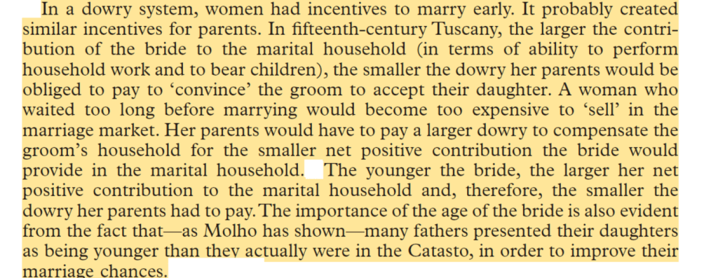 It could also take years for the dowry to be big enough to start a household, even without having the actual house. - On top of that both man and woman had careers.