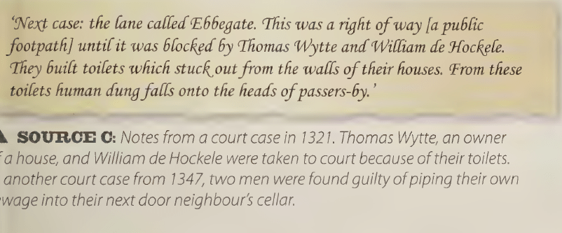 The following story is true but although it seems to have been used here to show how dirty the middle ages were, it actually shows that people got very upset when filthy things like this happened, they protested and the dirty boys were ordered to remove their toilets:
