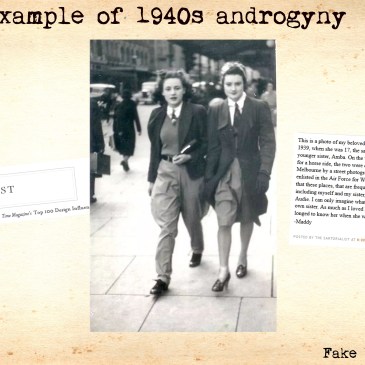 This picture is shared online as being an example of a girl dressed in an androgynous manner, a butch girl, a Teddy girl or as two lesbians in the 1940s. That is not the case. First lets agree on the definition of androgyny; “Not clearly male or female”“The quality or state of being neither specifically … More NOT an example of 1940s androgyny