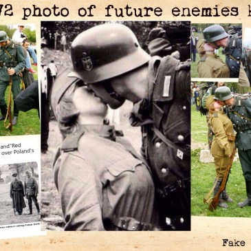This photo has been shared online with the claim that it shows a German soldier and a Russien soldier kissing during the joined invasion of Poland in September 1939. It does not. To me it was obvious that the photo wasn’t authentic, the uniform details weren’t right for 1939 but the people in the background … More NOT a WW2 photo of future enemies kissing